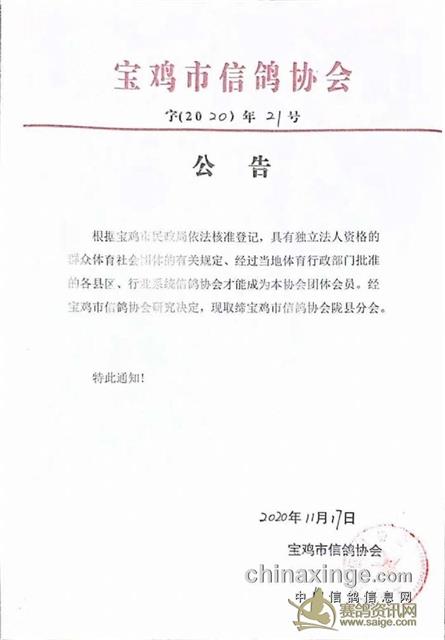 宝鸡市信鸽协会关于取缔陇县分会公告