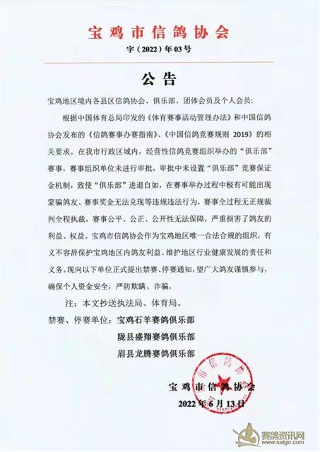 宝鸡市信鸽协会就本县赛鸽俱乐部、行业整顿的指示文件