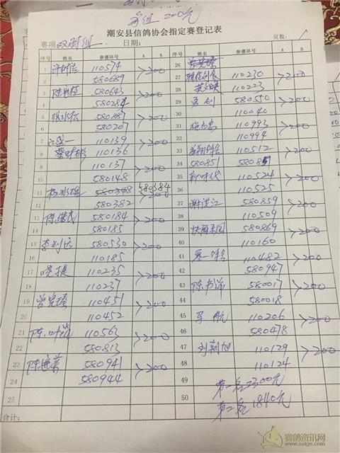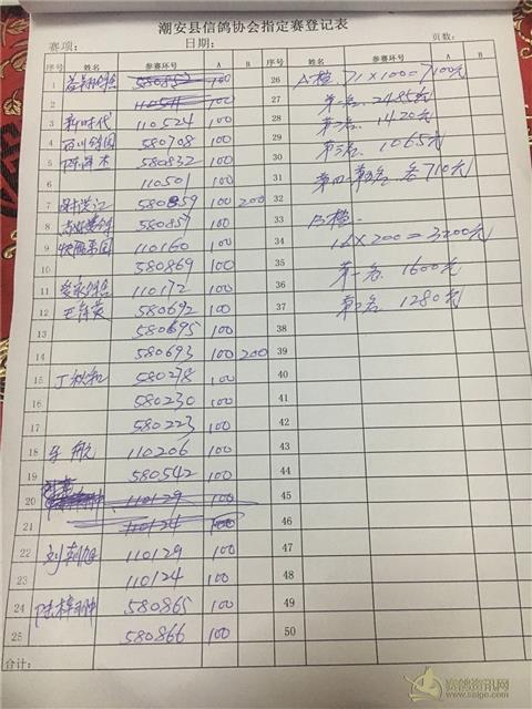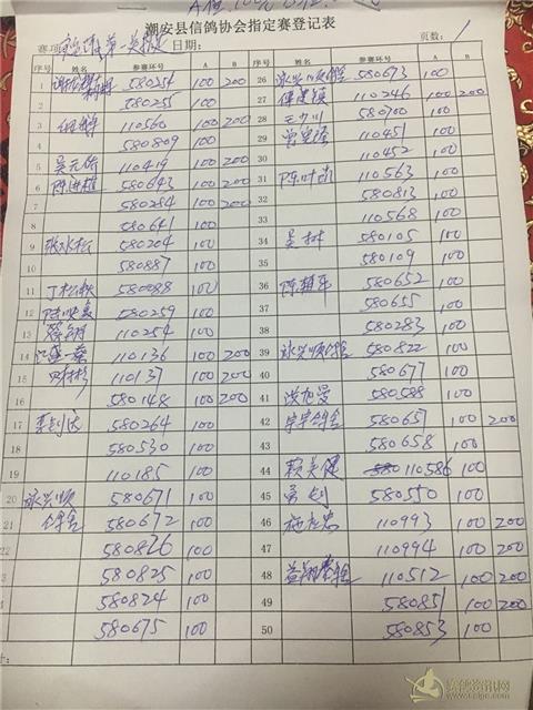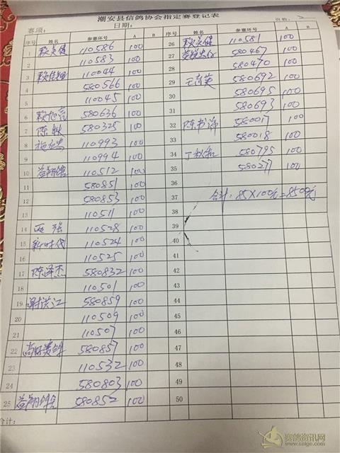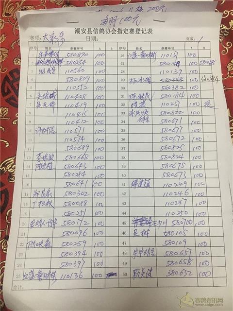 因工作人员登记错误,福清指定赛:第一页第39.40号。泳兴顺鸽舍:580822.580677.。改为:大家乐组:泳兴顺鸽舍:580826.傅建镇:580661. 指定100元组为69羽。奖金分配改为: 第一名:2415. 第二名:1380 第三名:1035 第四至五名各:690. 大家乐为87羽扣10%做费用,总奖金为:7830. 大家乐: