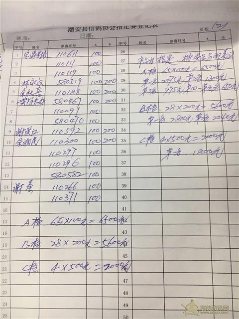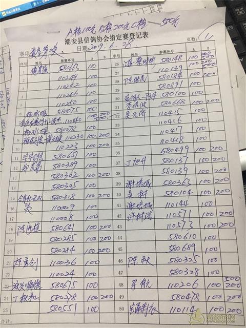 过关A组: 序号 棚 号 姓 名 足 环 号 码 1 000002 陈继民 2019-春夏-580184 2 000015 黄锐忠仔 2019-春夏-110091 3 000026 刘朝旭 2019-春夏-110124 4 000030 林永汉 2019-春夏-580519 5 000037 刘潮芝 2019-春夏-580003 6 000245 雅佳副食-黄文焕 2019-春夏-110223 7 000245 雅佳副食-黄文焕 2019-春夏-110230 金龙鱼赛鸽+江 8 000263 烘杰 2019-春夏-110440 9 000310 泳兴顺鸽舍 2019-春夏-580675 10 000333 MH370-马航 2019-春夏-110203 11 000333 MH370-马航 2019-春夏-110206 12 000333 MH370-马航 2019-春夏-580478 13 000333 MH370-马航 2019-春夏-580542 14 000448 许树浩 2019-春夏-110571 15 000448 许树浩 2019-春夏-580689 16 000481 郑良泉 2019-春夏-580305 17 000565 鸟弟赛鸽 2019-春夏-580314 18 000582 丁秋华 2019-春夏-580227 19 000582 丁秋华 2019-春夏-580278 20 000607 陈秋 2019-春夏-580325 21 000607 陈秋 2019-春夏-580328 22 000619 宇宇鸽舍 2019-春夏-580657 23 000632 潮州汇盛-蔡财彬 2019-春夏-580148 过关B: 序号 棚 号 姓 名 足 环 号 码 1 000026 刘朝旭 2019-春夏-110124 2 000245 雅佳副食-黄文焕 2019-春夏-110223 3 000245 雅佳副食-黄文焕 2019-春夏-110230 4 000333 MH370-马航 2019-春夏-110206 5 000333 MH370-马航 2019-春夏-580542 6 000607 陈秋 2019-春夏-580325 7 000632 潮州汇盛-蔡财 2019-春夏-580148 彬 过关C组: 序号 棚 号 姓 名 足 环 号 码 1 000333 MH370-马航 2019-春夏-110206 2 000333 MH370-马航 2019-春夏-580542 潮州汇盛-蔡财 3 000632 彬 2019-春夏-580148 参赛鸽数为: 3 羽