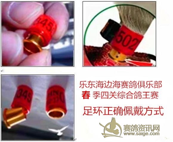 4.2023年乐东海边海赛鸽俱乐部(春季四关综合鸽王赛专环)的足环和金属内套环必须按规定佩戴于参赛鸽的同一只脚上,内环底拖必须托着主环(内环翻边在下)。注:如果套错将取消该羽鸽子的比赛成绩。