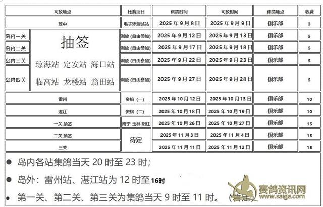 23. 2025年乐东海边海赛鸽俱乐部第四届三关综合鸽王赛为145元一枚(含电子环费),5枚起售;所有各站各关技能赛程与三关综合赛程同步;三关(抽签决定南宁、阳江、玉林)综合赛前两关在集鸽上笼完毕鸽车开走后由管理员和会员代表抽签开笼地点;岛内赛结束15天再放过海资格站。