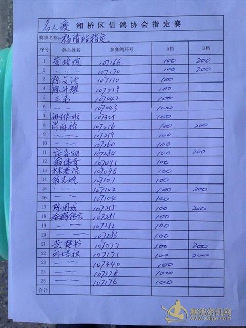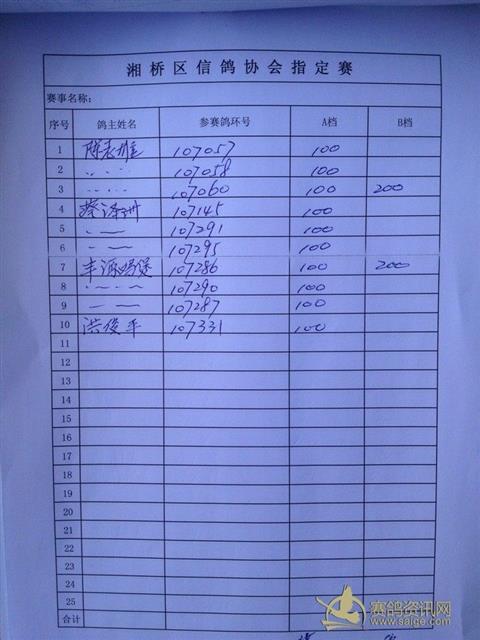 广东潮州市湘桥区信鸽协会2013年第二届名人赛400公里指定登记表