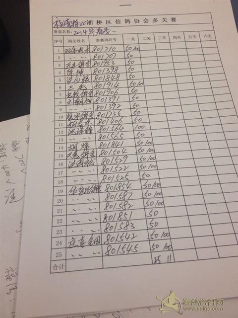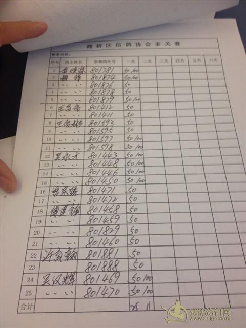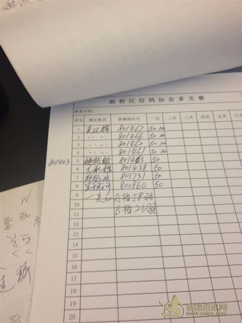 广东潮州市湘桥区信鸽协会2014年春季400公里多关赛登记表