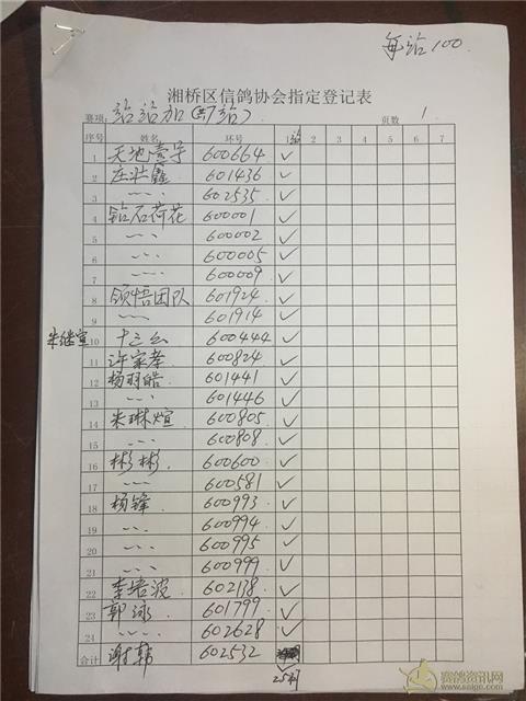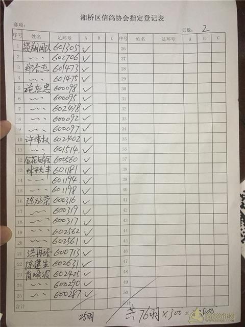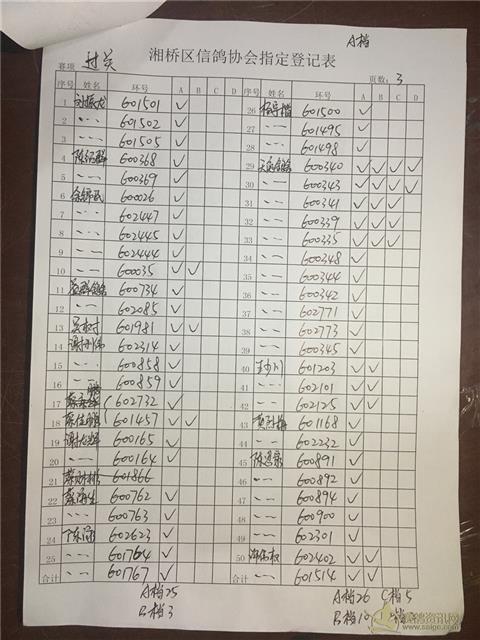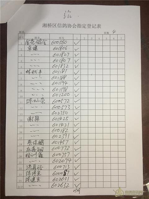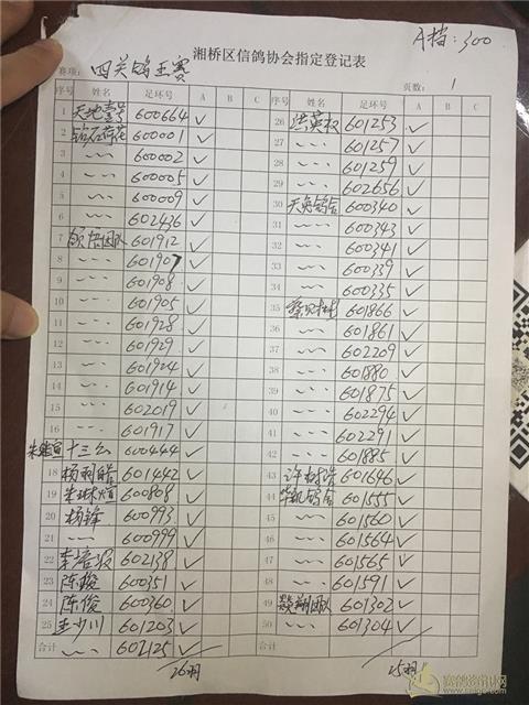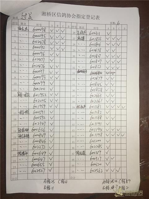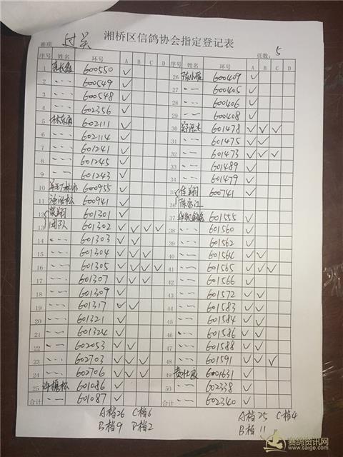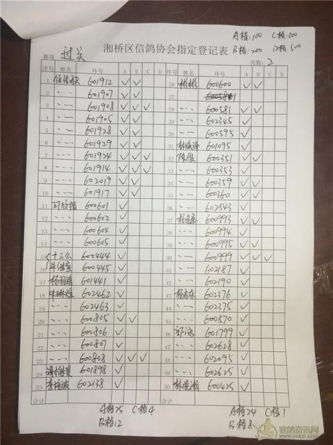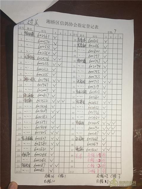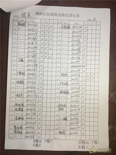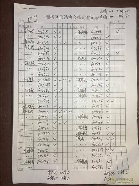 以下内表请各位鸽友认真校对。 站站加:101羽,过关A档348羽,B档122羽,C档52羽,D档8羽。 洪英权四关鸽王赛足环号602656更正为602653。