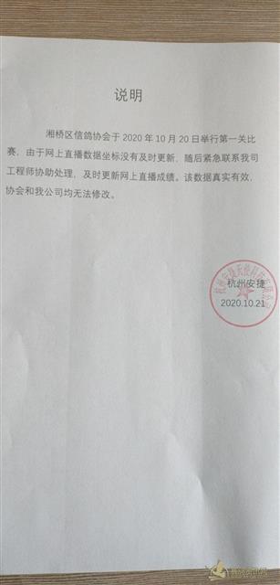 尊敬的会员,您们好, 湘桥区鸽会第一关比赛网站直播赛鸽归巢出现坐标没有及时更新的问题,造成归巢成绩无法及时正确传输数据名次和分速排名出现偏差,经过安捷公司技术人员远程协助处理后,重新更新,该数据真实有效。(协会及安捷公司无法擅自修改比赛数据),同时鸽会及时邀请友参与集鸽监放人员到鸽鹏现场直播,检查坐标。 根据安捷公司声明证实数据排名有效。 给大家带来困惑不便之处敬请谅解!