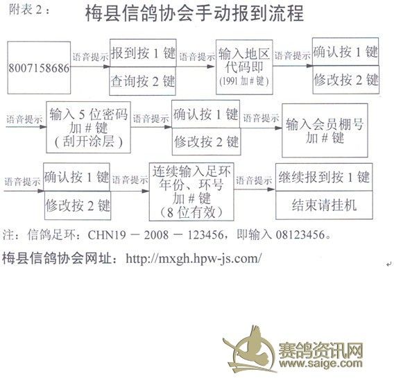 2、采用科汇公司全国统一电话报到系统报到(具体操作办法见附表2)和持鸽报到。如重复拨打,则以最后一次为比赛成绩,最后一次输错,以持鸽验鸽时间为准。双鸽赛以第二羽归巢时间为比赛成绩。排名按科汇公司报到系统自动排名为准。大赛前十名:城区的会员10公里范围内1小时内到服务部验鸽;分会的会员30分钟内打电话到鸽会服务部报到(报密码条后3位数及赛鸽环号号码),1小时内送分会指定地点验鸽,然后在比赛当天19∶00时前送鸽会服务部验鸽,城区其它得奖鸽在当天19∶00前送服务部验鸽。分会的到分会或指定地点验鸽。如发生自动识别系统上传失败,请在当天19∶00时前到服务部进行人工读取,超时则作自动放弃比赛成绩。放鸽当天至比赛结束,请会员不要练习报到,对违反制度乱报到的会员,一经证实,一律取消本春季大赛所有成绩。