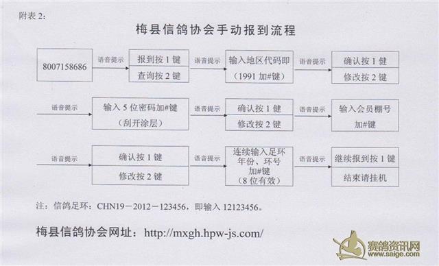 2、采用科汇公司全国统一电话报到系统报到,必须用本棚电话报到(具体操作办法见附表2)。如重复拨打,则以最后一次为比赛成绩。排名按科汇公司报到系统自动排名为准。大赛前十名:城区的会员10公里范围内,1小时内到服务部验鸽;分会的会员30分钟内打电话到鸽会服务部报到(报密码条后3位数及赛鸽环号号码),并由鸽会裁判通知在规定时间内送鸽会服务部验鸽。其它得奖鸽城区的在当天19∶00时前送服务部验鸽,分会的到分会或指定地点验鸽。如发生自动识别系统上传失败,请在10分钟内用本棚电话按科汇公司全国统一电话报到系统报到,由鸽会裁判通知验鸽地点在规定时间内验鸽。并在当天19∶00时前持“掌中宝”到服务部进行人工读取成绩,超时或不按上述规定操作则作自动放弃比赛成绩。放鸽当天至比赛结束,请会员不要练习报到,对违反制度乱报到的会员,一经证实,一律取消本春季大赛所有成绩。