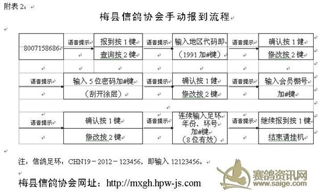 2、采用科汇公司全国统一电话报到系统报到,必须用本棚电话报到(具体操作办法见附表2)。如重复拨打,则以最后一次为比赛成绩。排名按科汇公司报到系统自动排名为准。大赛前十名:城区的会员1小时内到服务部验鸽;分会的会员30分钟内打电话到鸽会服务部报到(报密码条后3位数及赛鸽环号号码),并由鸽会裁判通知在规定时间内送鸽会服务部验鸽。其它得奖鸽城区的在当天19∶00时前送服务部验鸽,分会的到分会或指定地点验鸽。如发生自动识别系统上传失败,请在15分钟内向鸽会裁判长报告(电话:13560999681),由鸽会裁判通知验鸽地点在规定时间内验鸽。并在当天19∶00时前持“掌中宝”到服务部进行人工读取成绩,超时或不按上述规定操作则作自动放弃比赛成绩。赛鸽有效归巢时间内的报到截止时间为当天19∶00时。19∶00时后归巢的赛鸽,如不能上传的,请在第二天7∶00时前向鸽会裁判长报告(电话:13560999681)。放鸽当天至比赛结束,请会员不要练习报到,对违反制度乱报到的会员,一经证实,一律取消本秋季大赛所有成绩。