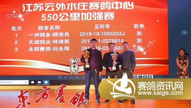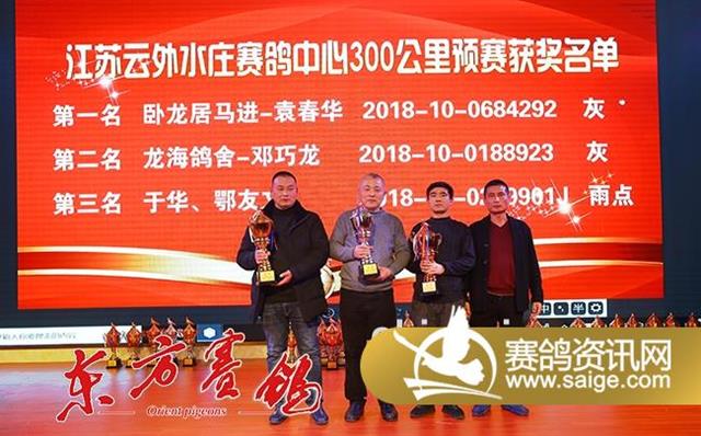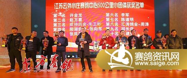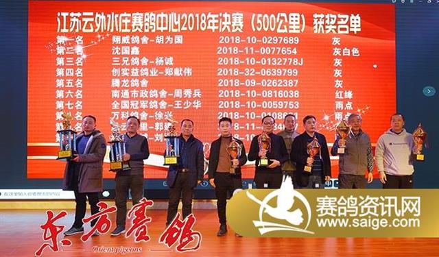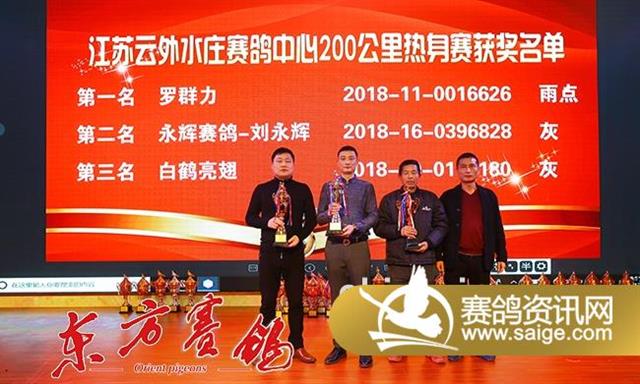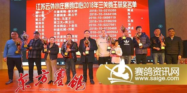 随后的颁奖环节,泰州市信鸽协会秘书长严子林、云外水庄公棚董事长高峰等先后为200公里热身赛和300公里预赛的前三名、大小团体的前十名、决赛的前十名、精英赛前三名、三关鸽王前十名、加站赛前三名颁发了奖杯,全场掌声雷动,经久不息。