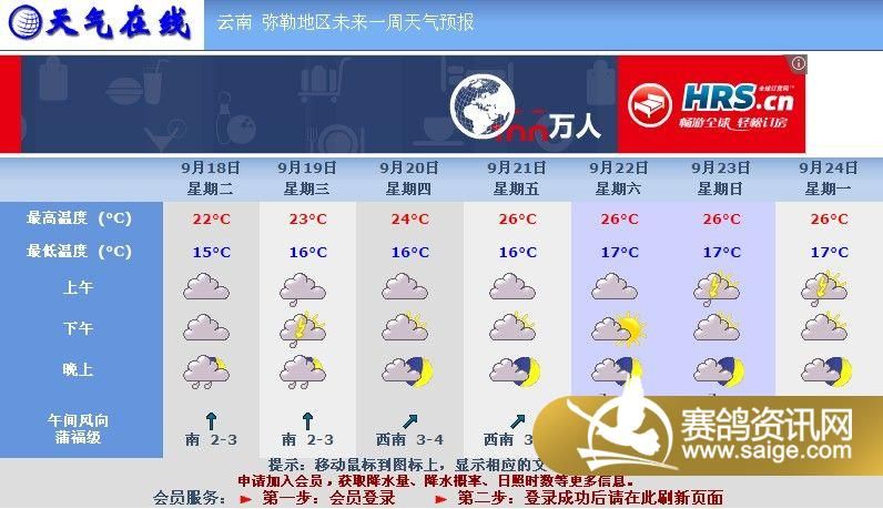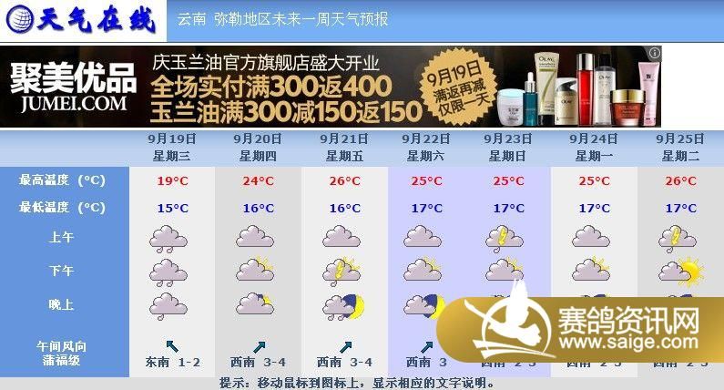 (参照天气在线网站时时更新天气情况) 尊敬的鸽友: 您好!根据“天气在线”预报天气情况,以及沿途石林、宜良、呈贡热心鸽友打来电话当地天气不理想,建议顺延。 红河公棚训练78公里(松茂收费站)定20日晚集鸽上笼,小奖正在火热报名中,20日下午17:00点收款、汇款传真终止,20至22点校对更正,次日不再变更,感谢合作。