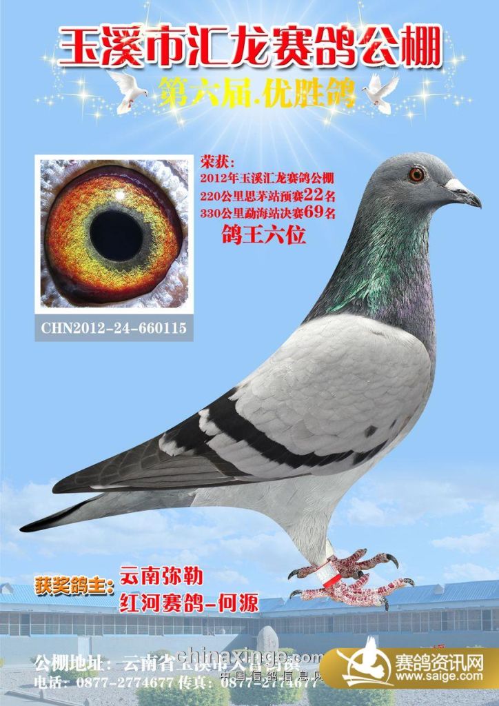 恭贺:本棚会员 红河赛鸽 何 源 2012-24-660115灰白条 荣获 2012第五届“汇龙”公棚勐海境330公里 决赛 69名;2012-24-666690灰 荣获 2012第五届“汇龙”公棚勐海境330公里 决赛 513名;