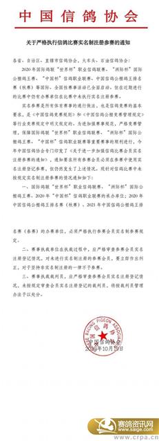 各位参赛会员: 应监管部门要求,中国信鸽(春赛)参赛会员必须以实名参赛,对坚持非实名制的会员一律不予参赛。 实名举例:实名、XX鸽舍+实名、XX公棚+实名 请未登记实名的会员联系电脑员添加,联系电话:18695458322
