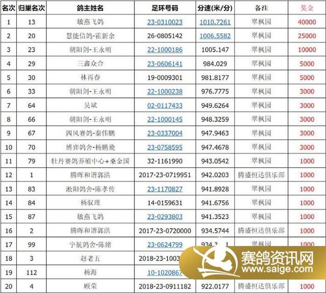 翠枫园与腾盛恒达赛鸽俱乐部联赛获奖清单前20名