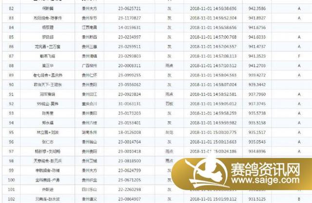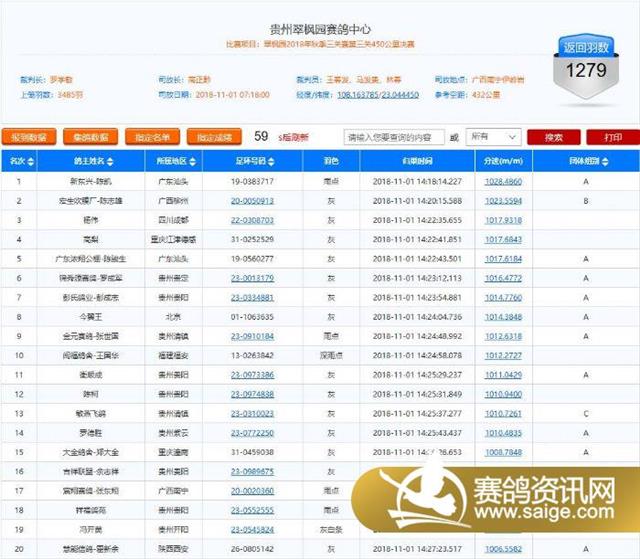 11月1日07:18,贵州翠枫园第十四届秋棚赛与清镇市滕达赛鸽俱乐部的联赛在广西南宁伊岭岩开笼,公棚上笼羽数3485羽,参加联赛232羽,俱乐部上笼485羽,全部参加联赛,空距432公里。