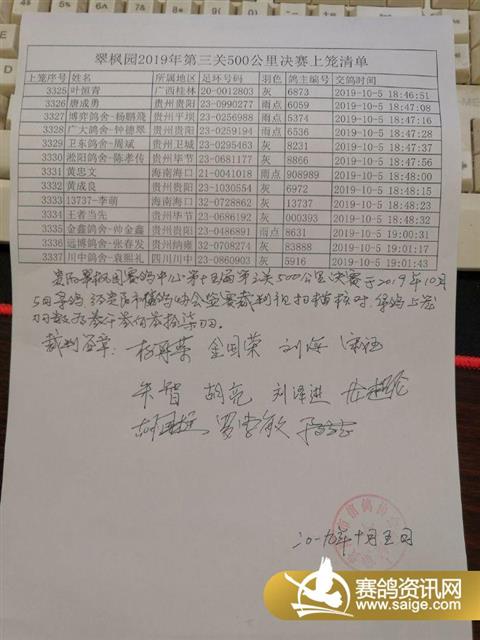 翠枫园2019年第三关500公里决赛上笼清单(按姓氏排序)