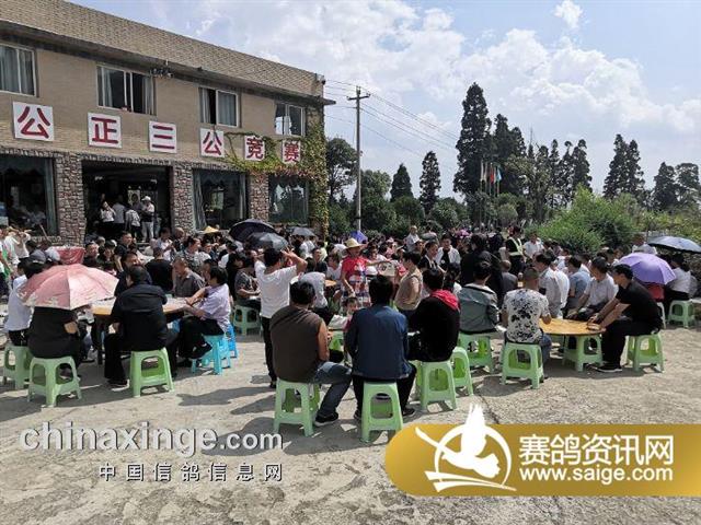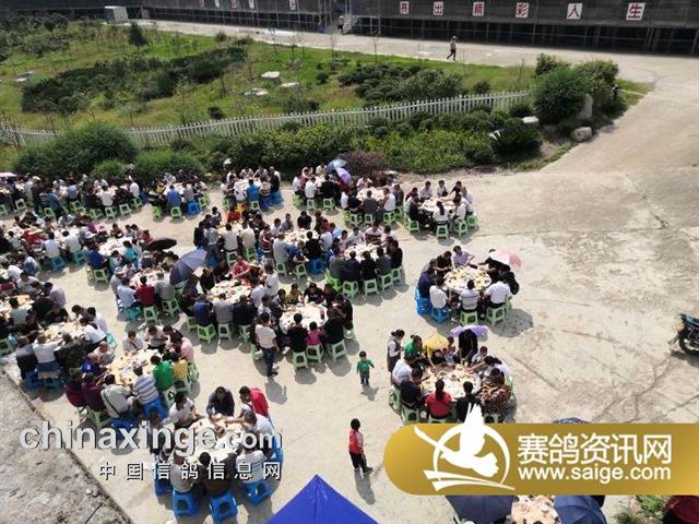 在翠枫园公棚内,10月6日前来现场观看比赛的鸽友足有600多人,恰逢国庆假期,许多鸽友带上亲友和小孩来到现场,共同见证这场别开生面的赛事。有的鸽友头天就来到公棚,见证了公棚一丝不苟的集鸽现场,有的清早从全省各地驱车而至,他们笑逐颜开静候自己的战将凯旋归来,公棚为鸽友准备了丰盛的18道菜款待前来观赛的鸽友,近30张餐桌,分两轮就餐才让鸽友用完午餐。
