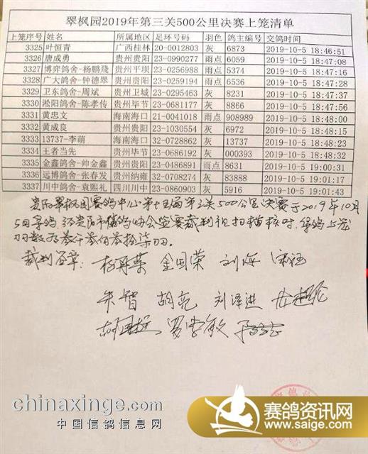 今天(10月7日一早, 7点:07分46秒第325名贵州毕节金海富鸿—王永忠 的23-0335201首先报到,到9点42分58秒贵州贵阳杨斌23-0332899 为主人夺得入赏最后的第500名次。翠枫园公棚以热身赛、预赛和决赛三次打破贵州公棚在该项赛事施放距离纪录并取得圆满成功,以骄人的赛绩向全国鸽友展示了一个老牌公棚的饲养管理和比赛水平。