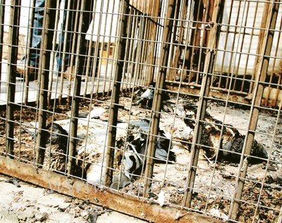 记者接到反映后迅速赶到现场。记者刚进入24号楼2单元的楼道,就闻到空气中弥漫着令人窒息的浓烟味。记者爬上7楼的天台看到,发生火灾的鸽棚为钢筋石棉瓦结构,体积庞大,长宽约5米,高约2米。将鸽棚分割为三块的铁栅栏也被烧得严重扭曲变形,石棉瓦顶棚坍塌。鸽棚的地面上到处都是面目全非的鸽子,大多数已被烧焦,其状惨不忍睹。 鸽棚主人的儿子告诉记者,鸽棚四周原本是一层铁丝网,但他们在失火后发现北侧的铁丝网已被剪断扔在一旁。记者看到,鸽棚北侧确有一处被剪断的痕迹。
