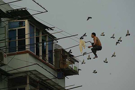 2004年2月25日,杨浦区鞍山八村一男子惊闻饲养多年的信鸽要被宰杀,酒后爬上自家阳台企图自杀以此要挟,经劝说终于自行爬下。据悉,上海发生禽流感疫情后,本市各居委会对部分飞禽采取了限制措施。 张驰 /摄