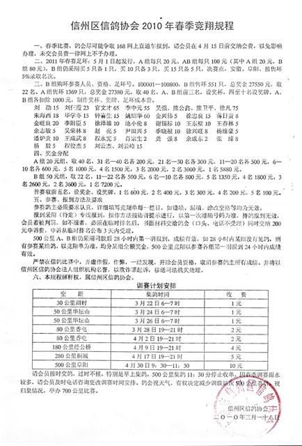 上饶市信州区信鸽协会2010年春季竞翔规程