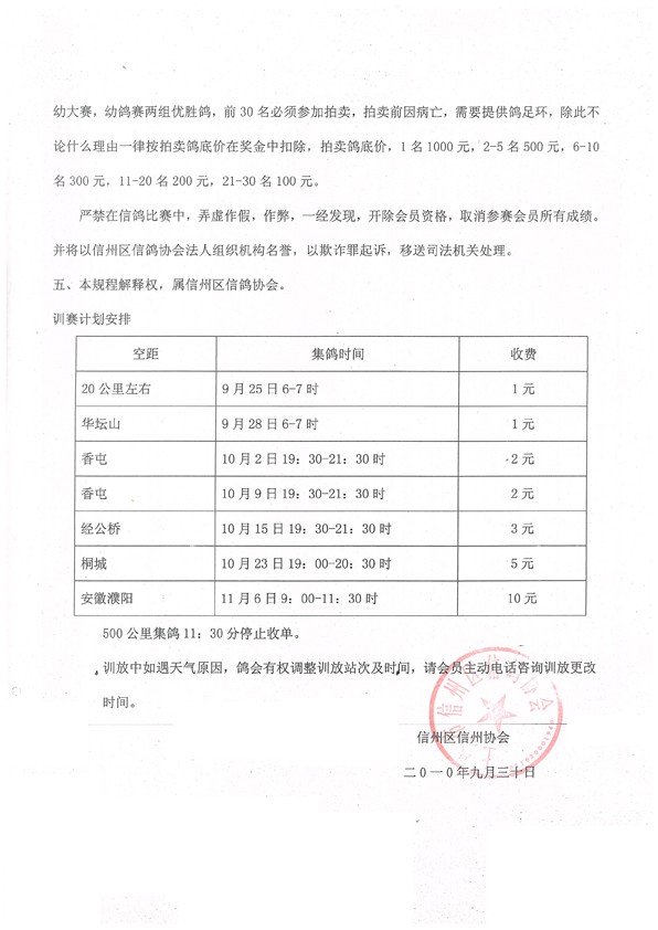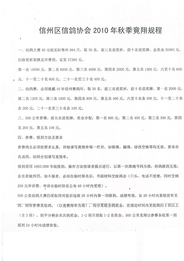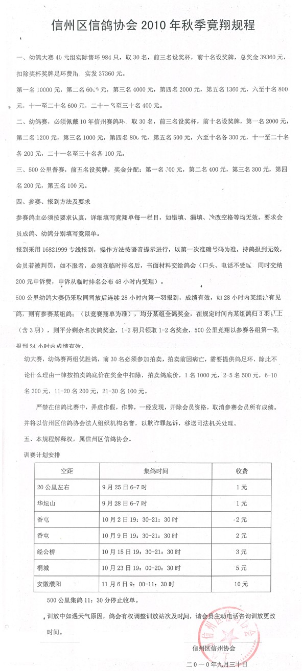 信州区信鸽协会2010年秋季竟翔规程