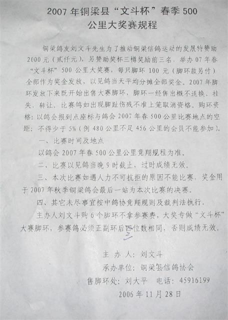 文斗杯是由我县鸽友:刘文斗捐资赞助.为交流鸽友文化.提高我县赛鸽比赛水平而举办的.规程如下: