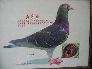 这羽鸽子的血统是纯正国血,夺冠分速1217米/分,当年参加全省品评4名,同年参加全国职工信鸽协会品评500公里品评冠军,冠军的头衔来之不易,97年的品评赛参赛鸽最多,但深羽色的鸽子只有这一羽,本来冠军已经归属他人,但在场的人多,裁判也多,为了这羽鸽子,鸽友与裁判之间因不同意见发生争执,在裁判多次协商以后最后判定这唯一深羽色的鸽子获得冠军.这羽鸽子也不负众望,当年秋秋季出鸽有一羽雌既获得98年秋季500公里比赛当天伯马冠军.此后前奖鸽很多都流淌着"美男子"的血液.兴隆堂为"美男子"喝彩!为它骄傲!!!
