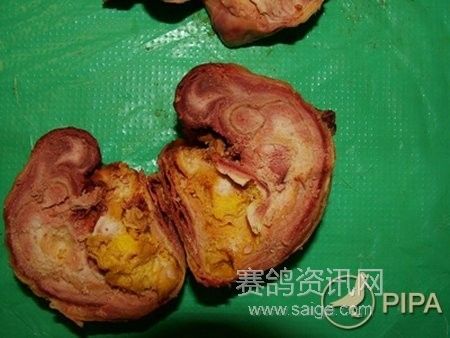 第二天,他将这只鸽子带来我的诊所解剖。外部检查显示在泄殖腔前有一个可触摸的比通常尺寸的蛋要大的物体。然而,这物体感觉凹凸不平而且有弹性,像个肿瘤多过像个蛋,当我好奇的打开腹腔,可见这物体就在输卵管的末梢。所以这的确是个蛋,我切开子宫壁时,一个真正的大蛋开始呈现,然而,它没有一个钙化的壳。(这是为什么在X光片中它不能呈现出清晰的反差影像)当我将它拿出来并且将它切成两半时,另一个惊人的事发生了:这个蛋的内部并不像通常看到的照片那样有白色液态的蛋白和蛋黄,而是一层层的凹凸不平的物质充塞其内。奇怪的是它看上去像在母鸽体内已经开始发育的胚胎。