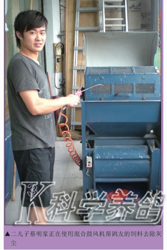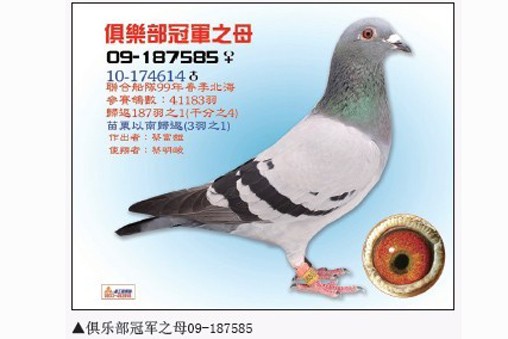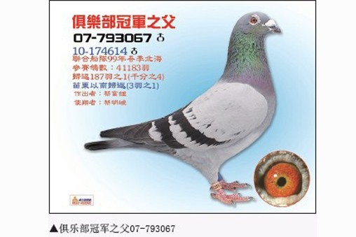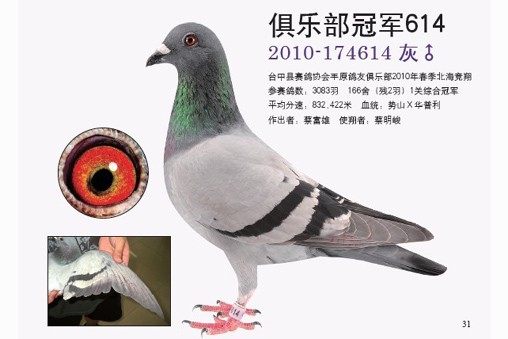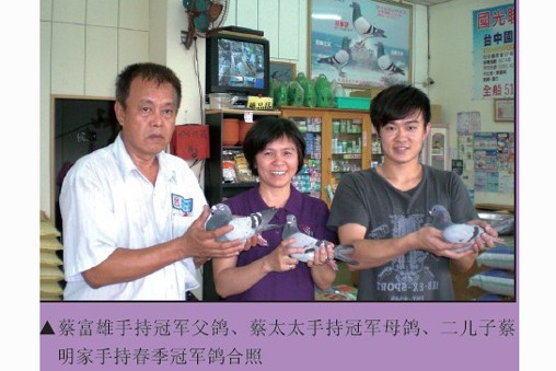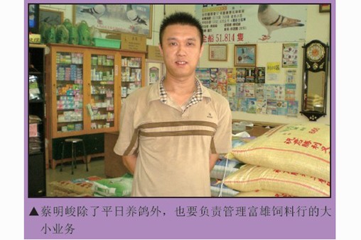 父子携手打造冠军鸽 蔡富雄29岁时在住家重新盖起了鸽舍。比赛一次后,他发现资格赛的规则不建全,就不再参赛。二十多年以来他专心于配对、育种、作出,延续鸽系的血源。直至大儿子蔡明峻退伍之后,他才又正式开始参加比赛,沉寂多时的鸽种才终于又在天际崭露头角。 蔡明峻,1980年出生,上小学时就跟在父亲身旁学习养鸽,也对鸽子充满了浓厚的兴趣。上高中时他就想以寄翔本地鸽店的方式参赛,但被人家拒绝了,原因是“这是大人玩的事儿,你年纪太小,不要来比。”从此之后,他就立志要自己亲自参加比赛,但是因为忙于学业,他正式参赛已是2004年的事情了。 2004年,蔡明峻首次参赛金门夏季南海竞翔。为了这场比赛,还特地申请将服兵役的时间向后推迟了一个月,可见他多么重视这次比赛。蔡明峻表示,由于他已经很多年没有参加过比赛,这次比赛目的主要是希望能通过比赛筛选出有利的鸽系。比赛结果证明,只要是配到势山与华普利系的鸽子都能入赏,并获得了综合第4、5名的好成绩。 2005年,当兵期间他曾寄翔友人,入赏了春季南海综合17位,该鸽为2004年综合4、5位的子代。2008年,在台中春季北海竞翔中,他的2008-227113灰母获得了台中冠军(398舍,8074羽残存28羽,由蔡富雄作出,蔡明峻使翔,教练潘杰),国光联合船队总冠军(全船51814羽)。在2010年春季北海竞翔中,他的2010-174614灰公获得了丰原俱乐部春季总冠军(全会2086羽残存2羽)。该鸽的父鸽是2008-227113的全兄,血系为势山系×华普利系,此家族都是纪录鸽延续的血统。该场比赛时海上下着大雨,该鸽仍能发挥实力实属可贵。蔡明峻说,该系的特性就是适飞下雨天,所以在春季比赛的表现特别突出。 目前富雄鸽舍内,势山系就占了80%。春季比赛以势山系为主是因为势山系在阴雨天或浓雾天都有相当明显的优势,表现也稳定。