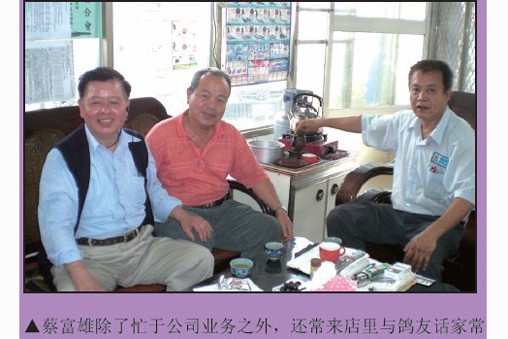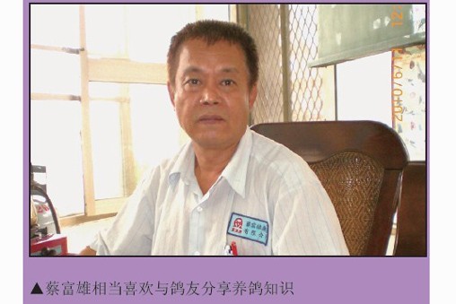 以冠军鸽近亲打造冠军鸽,蔡富雄始终坚持质量第一的原则,无论照明事业还是鸽业皆是如此。2010年春季他再度获得总冠军,他表示做任何事情不仅要用心,更要力行,因为成功不是偶然的,只有大家共同努力,荣耀才能延续。 与鸽结缘 蔡富雄1955年出生,中国台湾台中大肚人。受邻居养鸽的感染他从小便对鸽子充满了兴趣。初中二年级,他拿着阿公给的5元零用钱,从鸽店买了一羽花鸽子,回来后觉得一羽鸽子太孤单,就又去买了一羽,就这样鸽子越买越多。学生时期每天一早他喂完鸽子后才去上学,放学后便赶紧冲回家,只为看着成群的鸽子在天际飞翔。 退伍后,他开始从事照明事业,并自创“富雄牌”,研发出多款专利产品。即使工作再忙碌,他还是会亲自养鸽,不假他人之手。