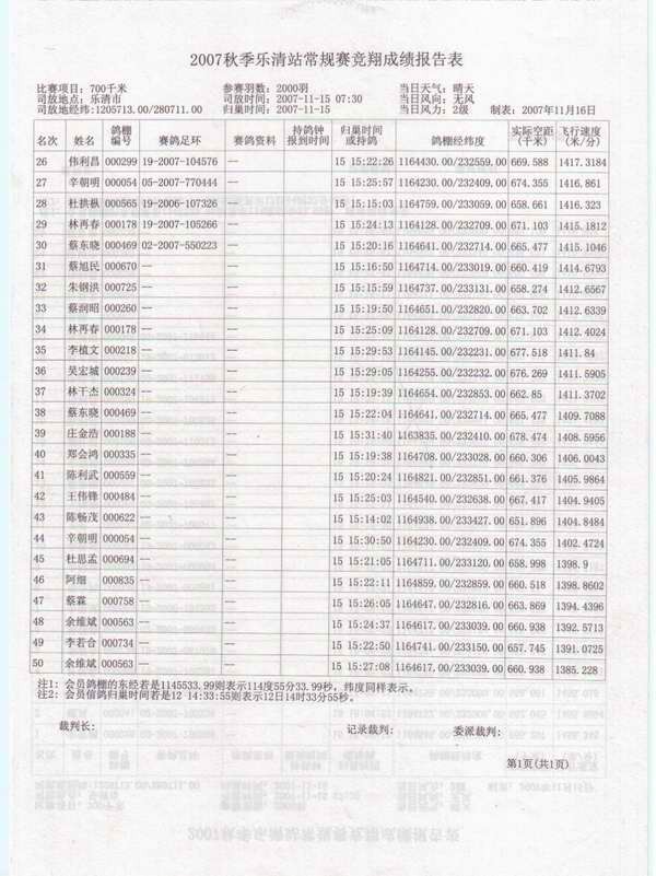 汕头市龙湖区信鸽协会700公里乐清站常规成绩