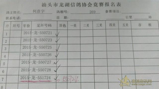 2015汕头市龙湖鸽会秋季5区西北三关鸽王赛足环更正公告 会员姓名:何彦宇 棚号:269 有误参赛鸽足环号:2015-龙-551724,因工作人员疏忽,滚印录入足环号码为551724现更正为550724。