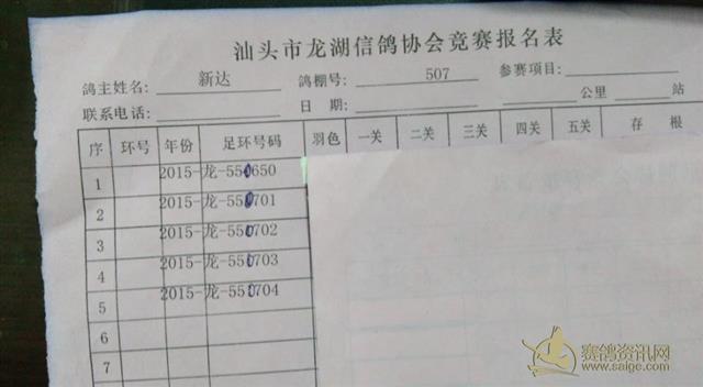 有误参赛鸽足环号:2015-龙-551703,因工作人员疏忽,滚印录入足环号码为551703现更正为550703。