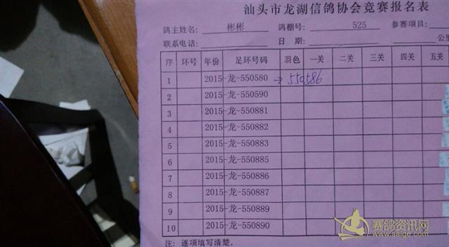 有误参赛鸽足环号:2015-龙-550580,因工作人员疏忽,滚印录入足环号码为550580现更正为550586。