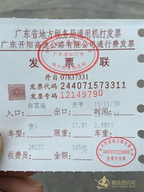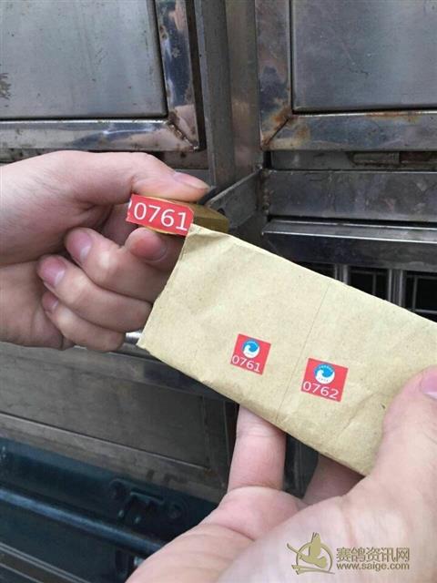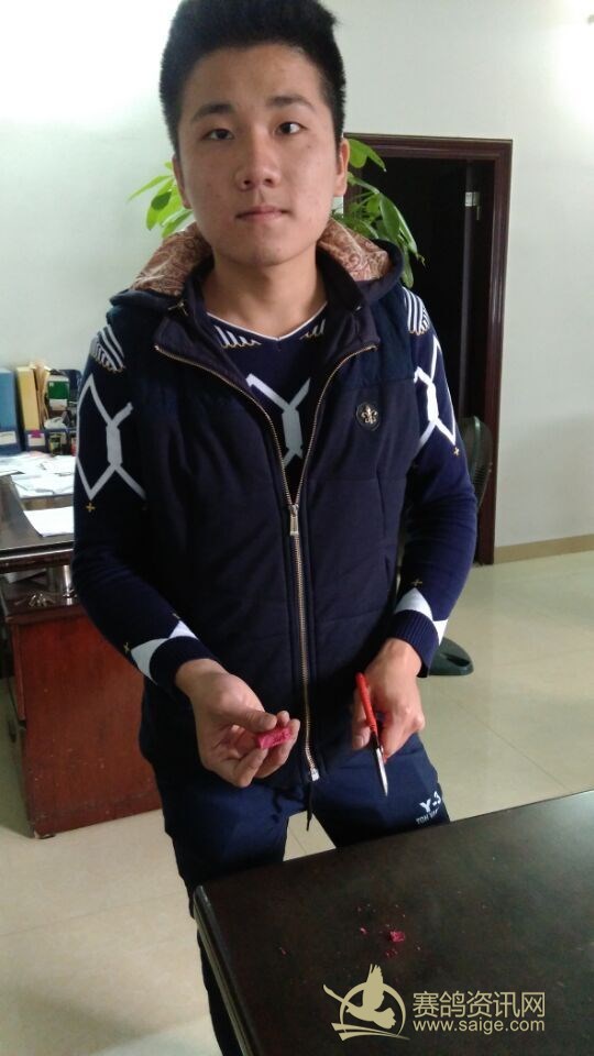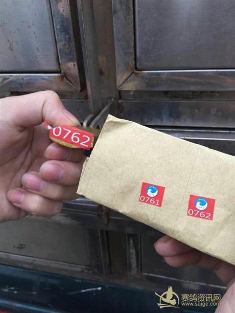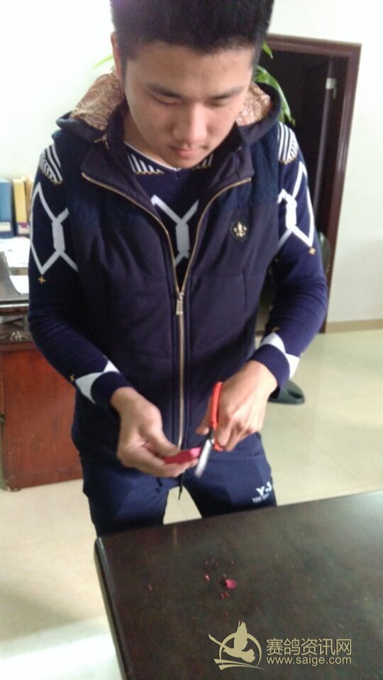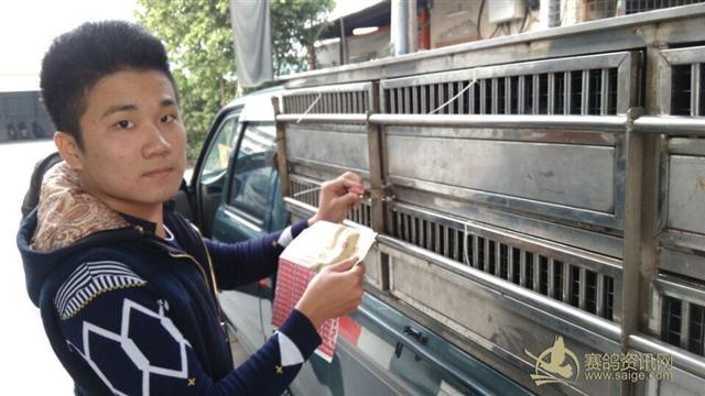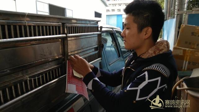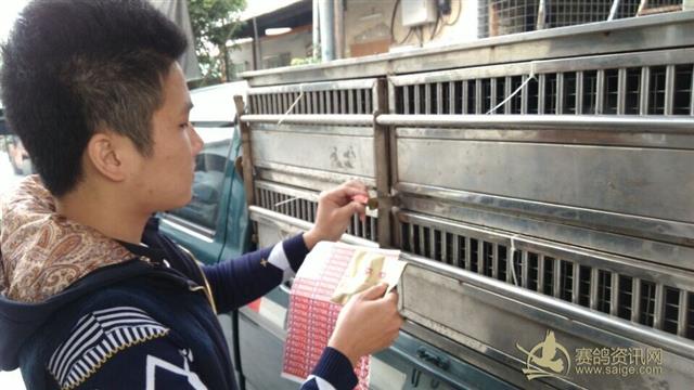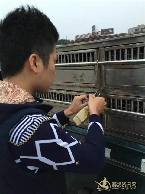 随车监放员为2015年冬季预赛冠军鸽主蔡建伟代表集鸽后销毁印鉴: