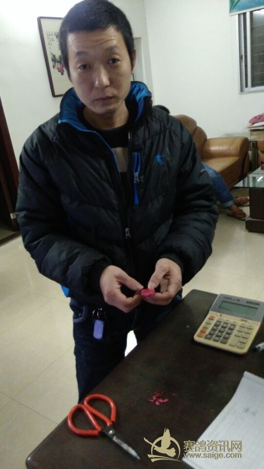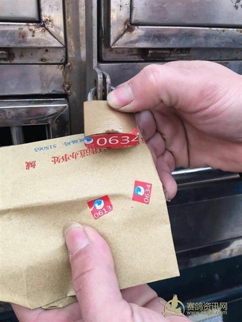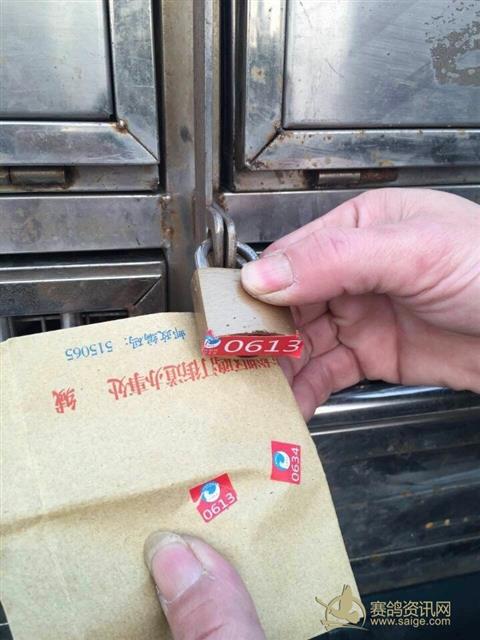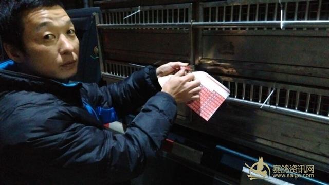 随车监放员为2015年冬季决赛冠军鸽主陈斯扬代表集鸽后销毁印鉴: