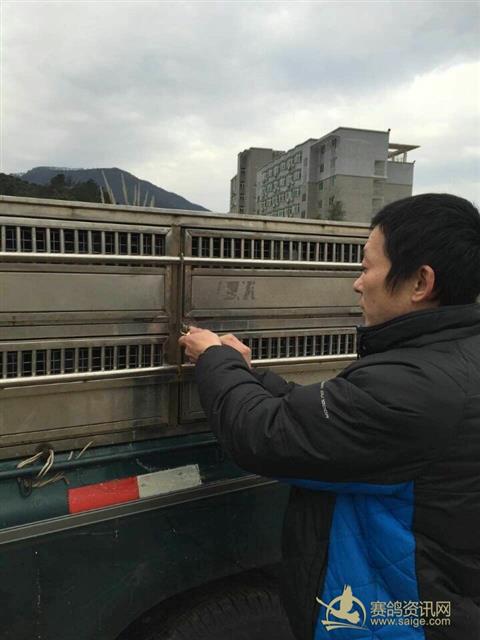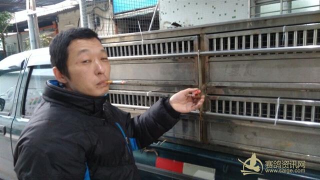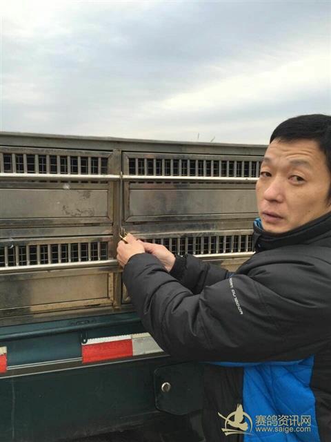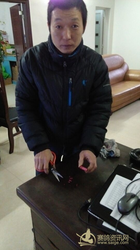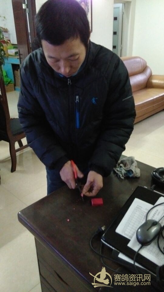 随车监放员为2015年冬季决赛冠军鸽主瑞迪代表集鸽后销毁印鉴: