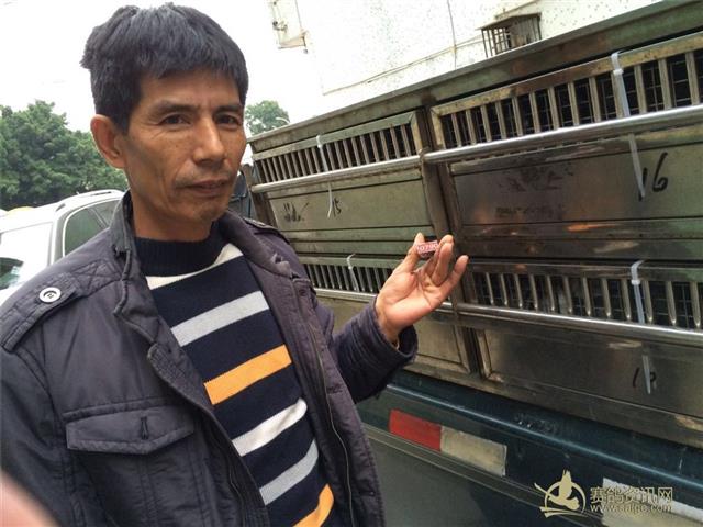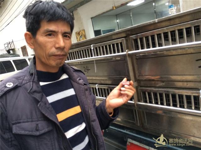 随车监放员为2017年元旦预赛冠军鸽主许伟民代表集鸽后封车:
