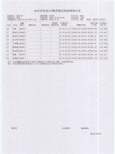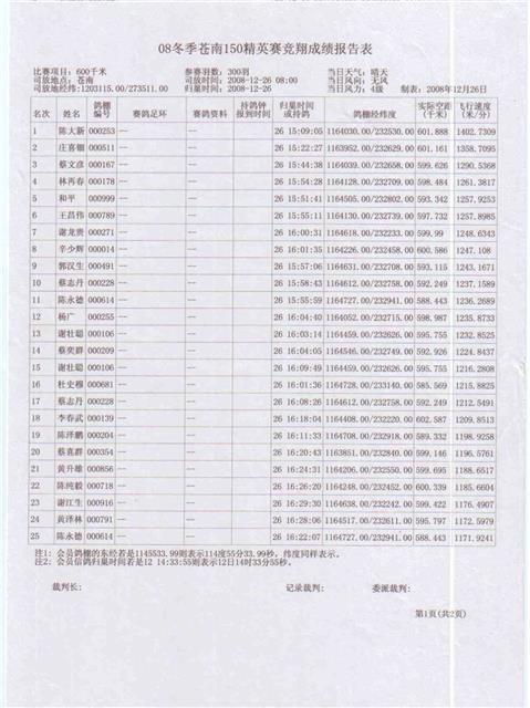 龙湖信鸽协会08冬季苍南150精英赛成绩,请校对