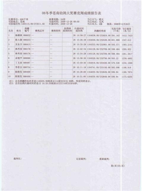 龙湖信鸽协会08冬季苍南大奖赛成绩,请校对