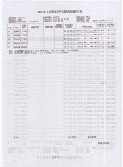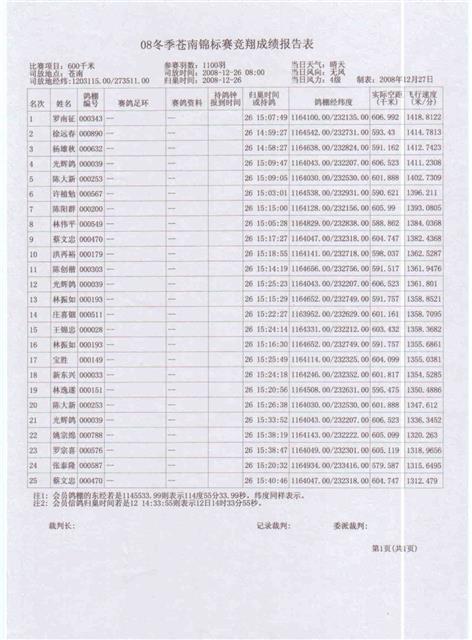 龙湖信鸽协会08冬季苍南锦标赛成绩,请校对
