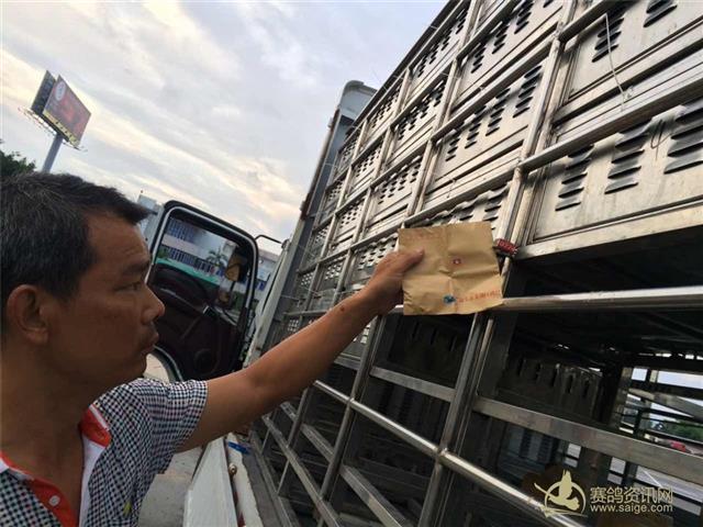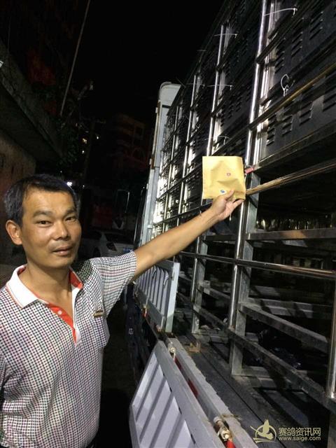 随车监放员为2017年春季决赛冠军鸽主陈建雄代表集鸽后封车: