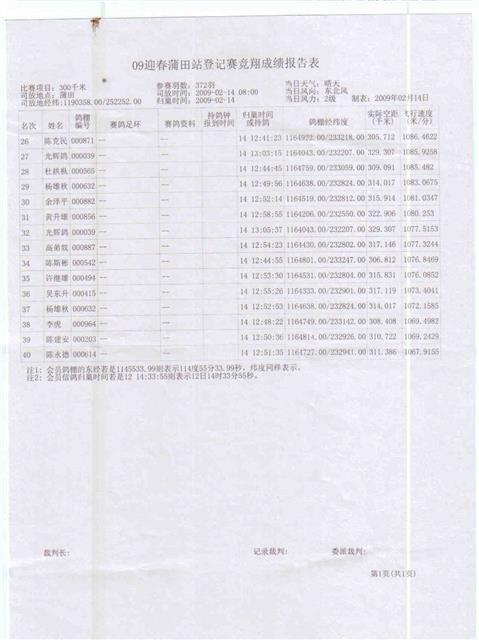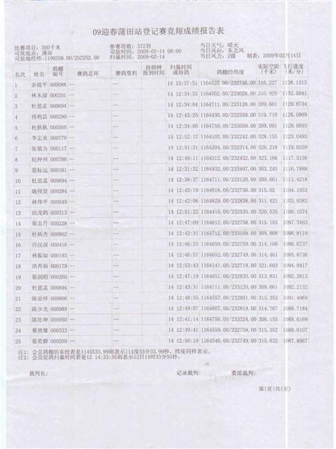 汕头市龙湖区信鸽协会09迎春赛蒲田站登记赛成绩,请校对