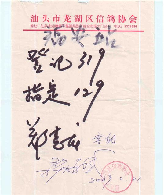 汕头市龙湖区信鸽协会09迎春赛福安站登记、指定