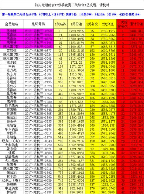 汕头龙湖鸽会17秋季竞赛二关综合A总成绩,请校对