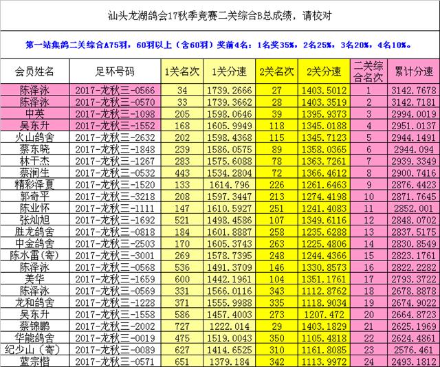 汕头龙湖鸽会17秋季竞赛第三关(平阳)二关综合B成绩,请校对