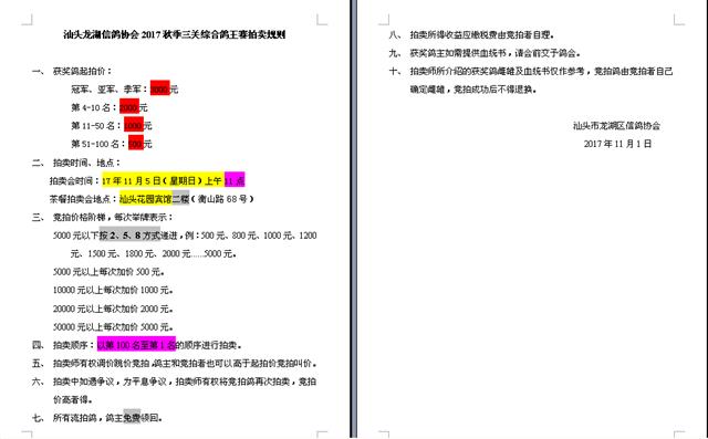 汕头龙湖鸽会2017秋季三关综合鸽王赛拍卖规则