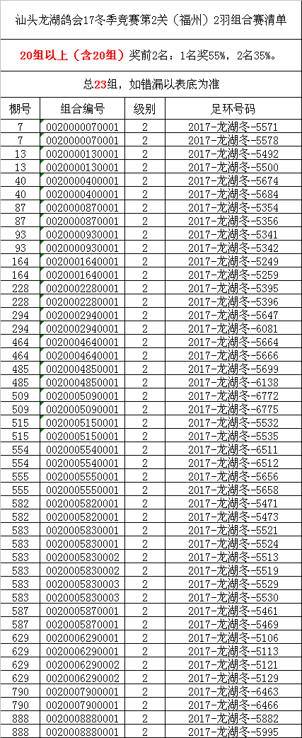 汕头龙湖鸽会17冬季竞赛第2关(福州)2羽组合赛,总23组,清单