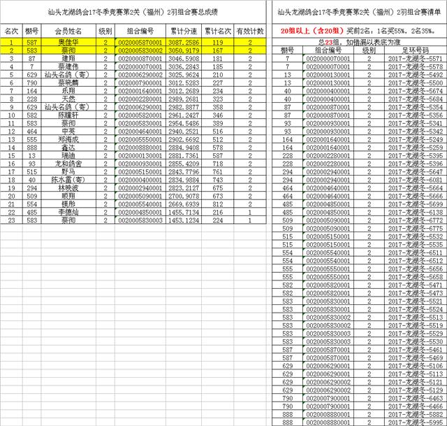 汕头龙湖鸽会17冬季竞赛第2关(福州)2羽组合赛总成绩